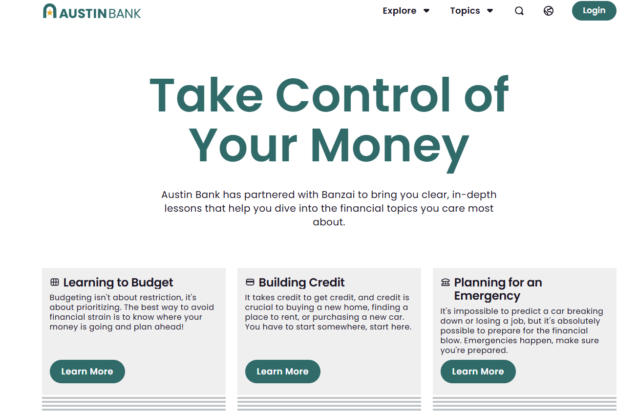Understanding the basics of finances is important and developing good money habits is essential for every stage of life. That is why we have partnered with Banzai® to create the Austin Bank Financial Wellness Center. Filled with topics of interest for everyone, these short lessons and videos will prepare you with the right skills to manage your financial future. Start learning today to make an impact on your financial future.